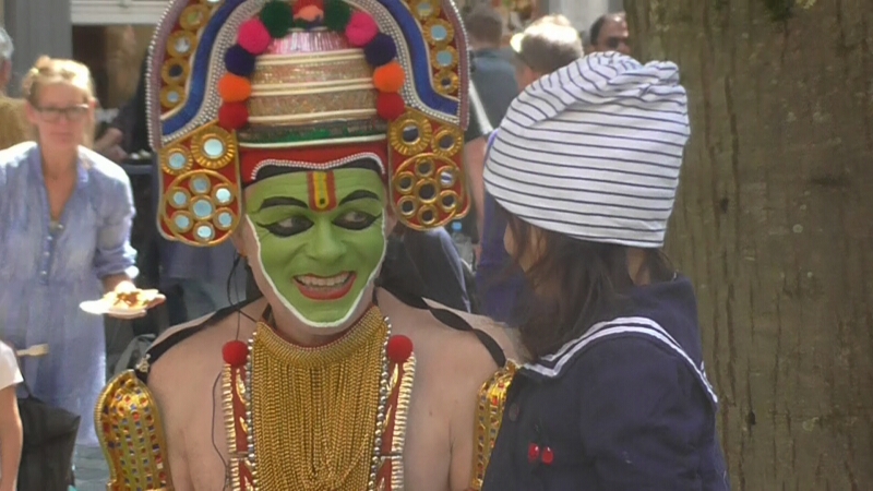 After the ritual of "paying respect to the ground" and some explanations about the makeup and costume I mostly perform the often quite humorous presentation of the "nine different gestures" (Navarasa). During "Bhima meets Hanuman" (Kalyāṇasaugandhikam) I will ask some children to come onto the stage and support me in this freely improvised story. Participation exercises on rhythm, dance and facial expression round off this part of the performance. At the end I will then perform a humorous, critical or philosophical excerpt from one of my German Thuḷḷal stories (details upon consultation and by agreement).